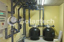 专业扬水逆变器驱动过滤泵工作,无需储能电池,在光照不足时或夜间可以自动切换到市电系统供电。
