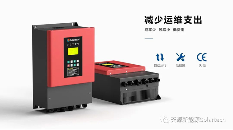 Solartech PB-G3光伏扬水逆变器,内置升压电路拓宽光伏输入电压范围,集成光伏优先、市电互补、远程监控、多泵并联、分期加密等功能,优化控制器和外置功能器件为一体,无需加装功能器件和外购控制柜体,可直接户外安装。在同样高品质的情况下,帮助用户减少运维支出。降低故障风险,节省投资成本。