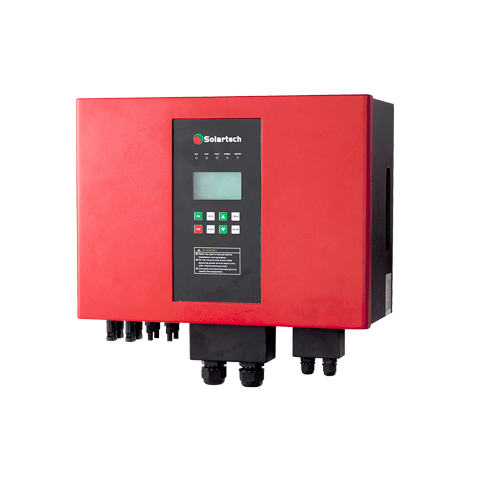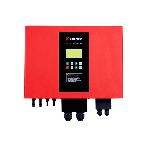 光伏扬水逆变器对系统的运行实施控制和调节,将太阳能阵列发出的直流电转换为交流电,驱动水泵,并根据日照强度的变化实时地调节输出频率,实现最大功率点跟踪(MPPT)。